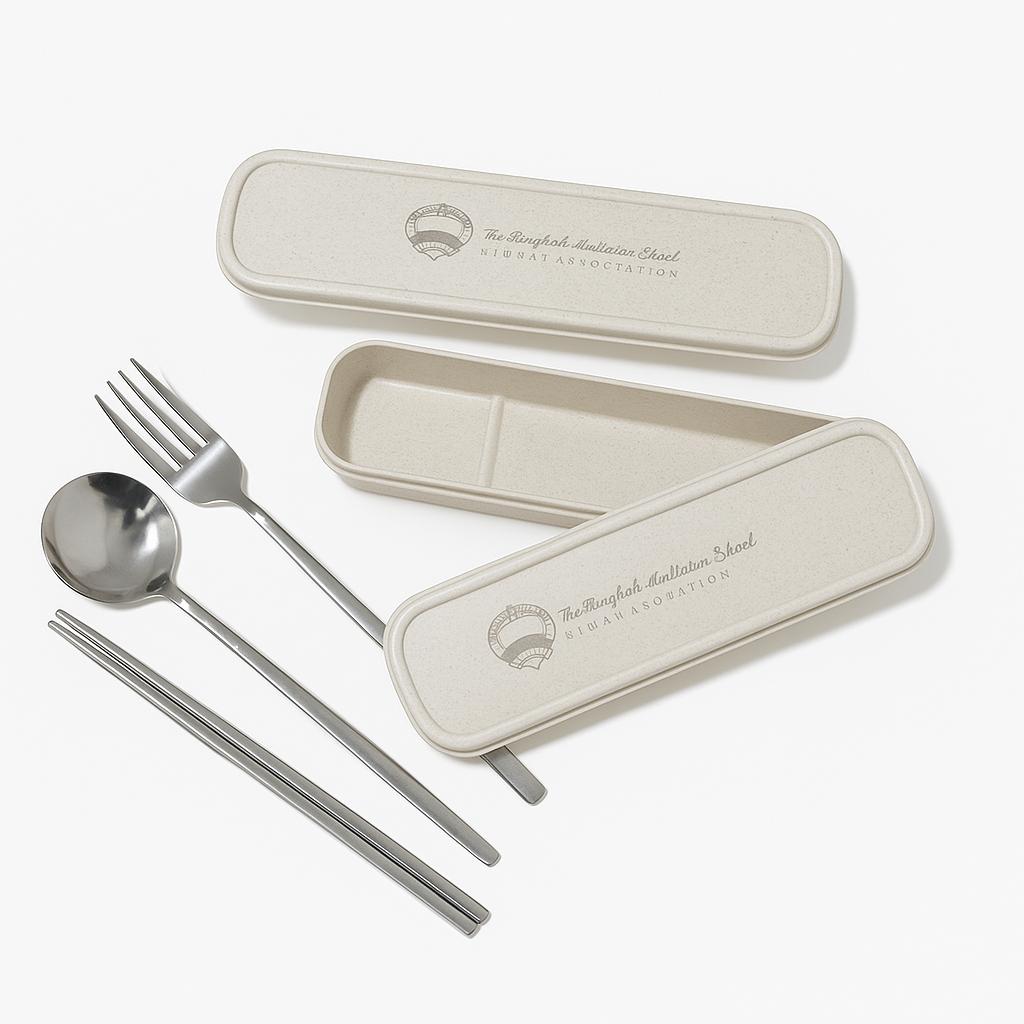 A pair of chopsticks, a spoon and a fork in a handy racked carrying box.